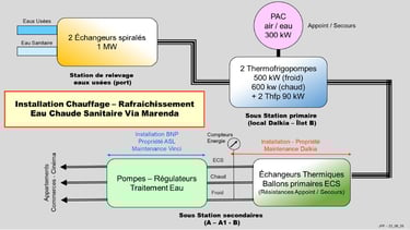Le schéma ci-dessous est assez technique, mais le principe est assez simple. Un serpentin est placé dans une station d'épuration de la ville. Ce serpentin récupère les 3 ou 4 degrés de chaleur supplémentaires des eaux usées et sanitaires et alimente un réseau primaire qui transporte ces calories jusqu'à des pompes à chaleur. L'été ces pompes transforment ces calories en frigories. Un réseau secondaire récupère les calories ou les frigories et les amène dans des sous-stations (il y en a trois dans notre complexe). A partir de ces sous-stations, ce réseau va dans nos montées jusqu'à nos paliers. Pour chaque appartement, un échangeur eau-air ou des radiateurs apportent la chaleur ou le froid avec régulation par appartement.