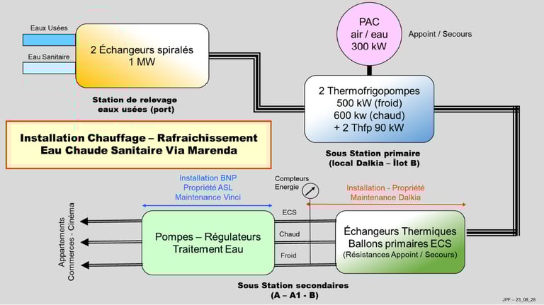Notre complexe Via Marenda a été conçu avec la volonté de mettre en oeuvre un système de récupération de chaleur des eaux usées de la ville. Ce dispositif innovant est complexe.